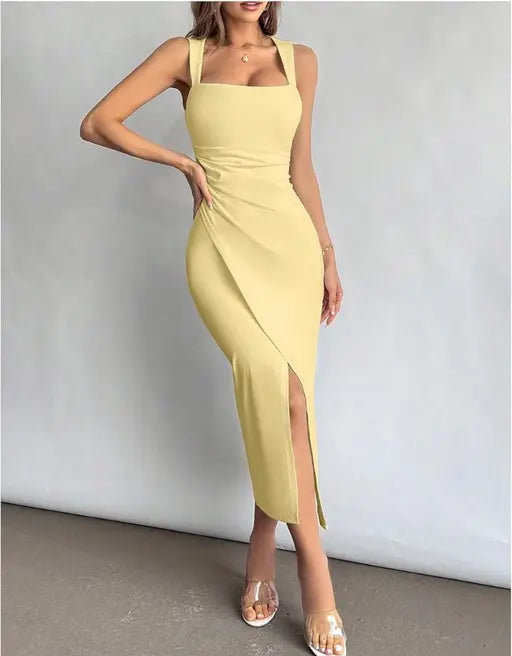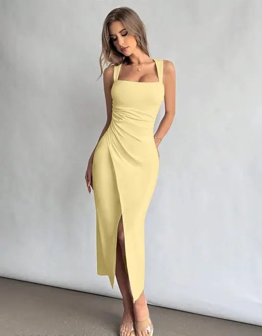 Women's Square Neckline Ruched Waist Slit Dress For Vacation, Daily Wear, Wedding Season and party